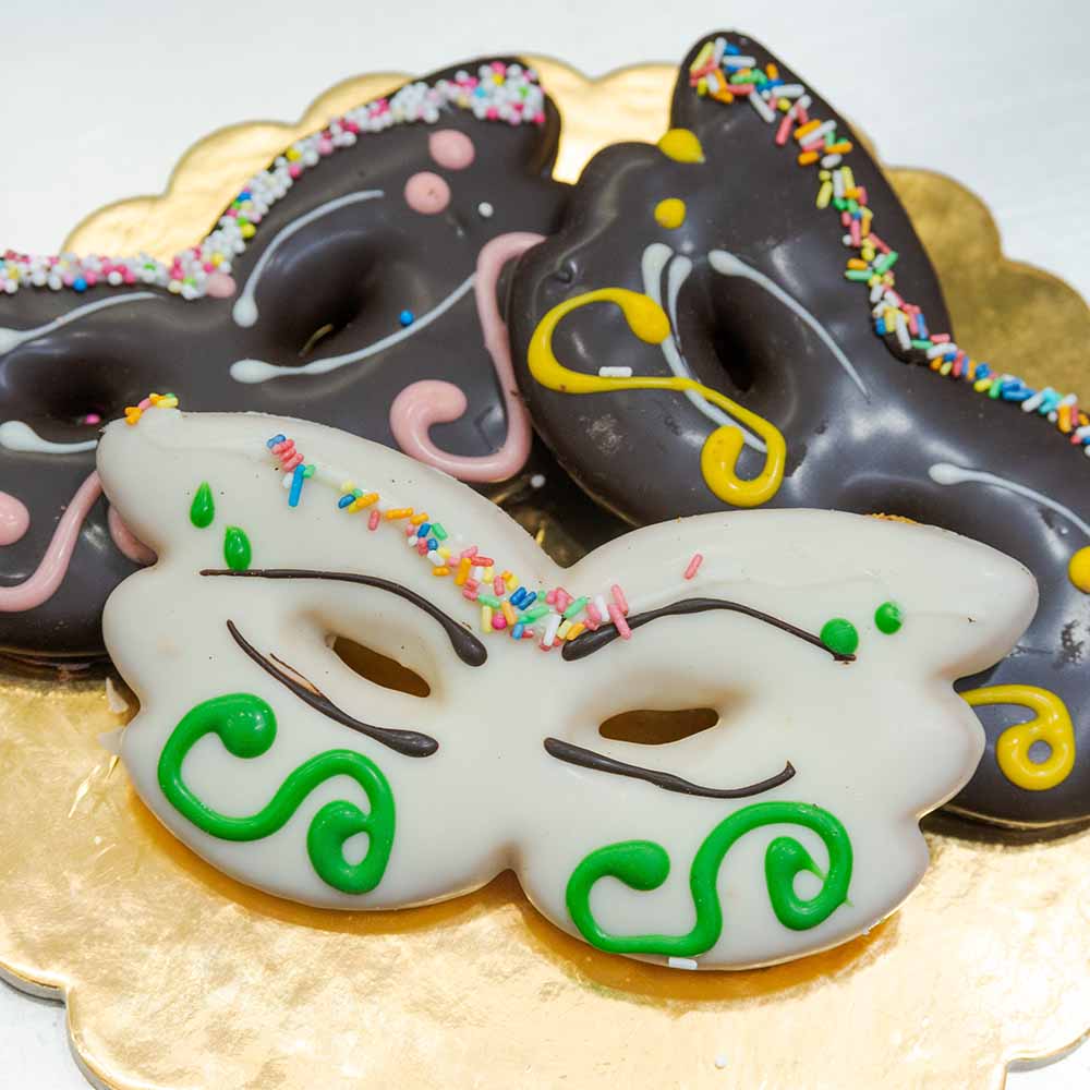 FARINA 00, Margarina (grassi vegetali: palma, cocco; acqua; olio vegetale: girasole; SOIA; grasso vegetale parzialmente idrogenato: palma, lecitine; sale; emulsionanti: mono- e digligeridi degli acidi grassi; aromi; correttori di acidità: acido citrico; citrato di sodio; coloranti: caroteni), Zucchero, UOVA, Aroma vaniglia e colorante E 102- E124. Surrogato cioccolato fondente (zucchero, grassi vegetali frazionati e totalmente idrogenati (palmisto), cacao magro in polvere (23%), emulsionante: (E322 (girasole), E492), aromi) e avorio (zucchero, grassi vegetali frazionati e idrogenati (palmisto), siero di LATTE in polvere, LATTE intero in polvere, emulsionante: (E322 (girasole), E492, E472c), aroma) e coloranti E102 – E124 –E133 –E151 (olio vegetale(palma), aroma vaniglia), Codette di zucchero (zucchero, sciroppo di glucosio, oli vegetali (cocco, colza), amido di mais, emulsionante: lecitina di SOIA, colorante: E100, E120, E131, E132, E160a, E172, agente anti agglomerante: talco).