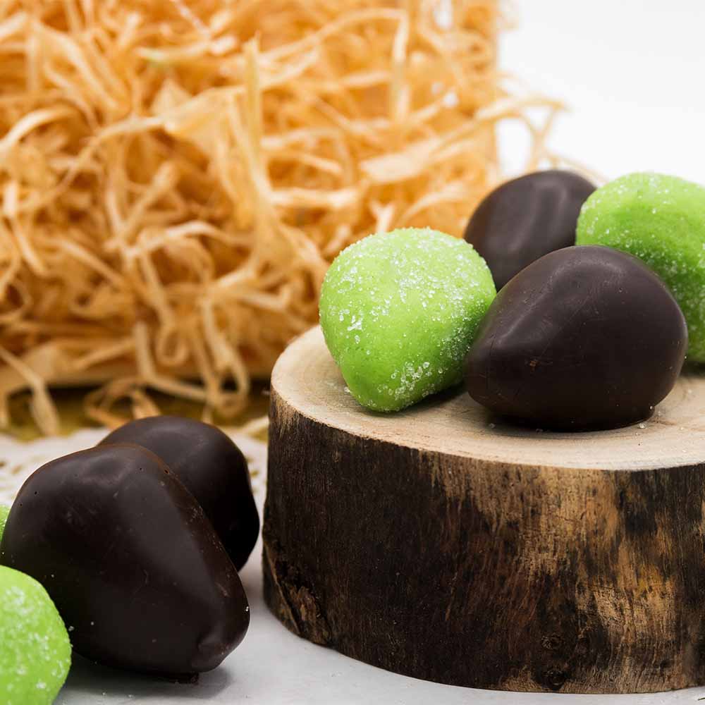 Ricoperte con surrogato fondente (zucchero, grassi vegetali frazionati e totalmente idrogenati (palmisto), cacao magro in polvere (23%), emulsionante: (E322 (girasole), E492), aromi).